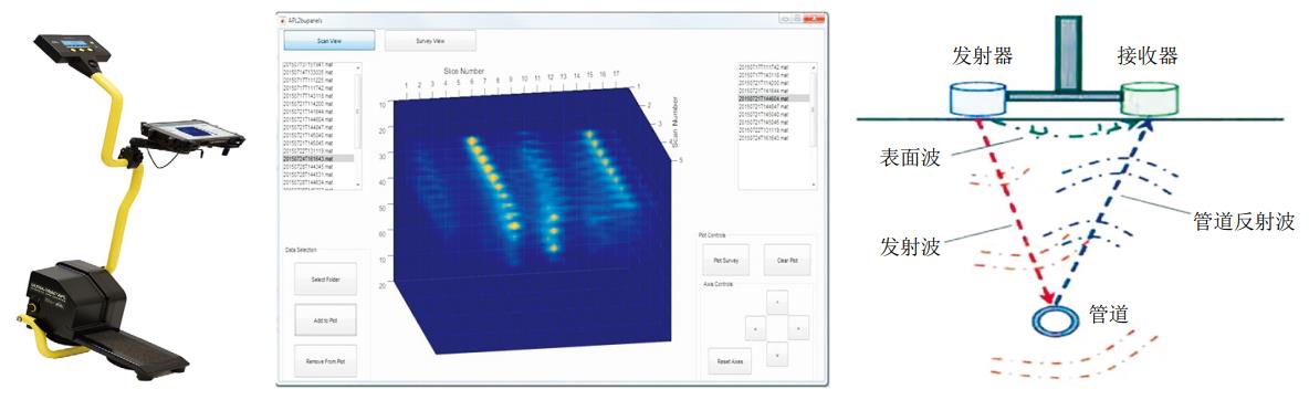 該方法多用于地下管線(xiàn)較少時(shí)的管道輔助探測,適用于全部淺埋金屬和非金屬管道,市政公用管道應用較多。典型設備如美國杰恩公司APL聲學(xué)管線(xiàn)定位儀(圖 3)。其工作模式類(lèi)似于探地雷達,通過(guò)發(fā)射器向地面發(fā)射探測聲波(探地雷達是發(fā)射電磁波),接收器接收探測聲波的反射波,完成一次“斷面探測”,通過(guò)多次斷面探測記錄的反射波的強度、速度和持續時(shí)間等計算出地下管道的位置、管徑等信息。