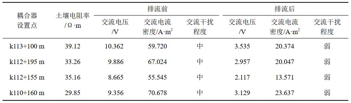 (1)管道穿越京滬高鐵等電氣化鐵路7處。與直供式電氣化鐵路交叉地段,應至少在交叉段的其中一側設置一處排流防護點(diǎn)。設計施工階段各穿越點(diǎn)一側設置了耦合器排流,用以排出流入管道的雜散電流。以京滬高鐵穿越為例,排流效果見(jiàn)表 1。結果表明,最大交流電流密度小于標準規定的30 A/m2,交流干擾程度判斷為弱。