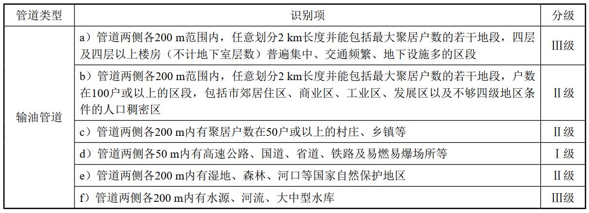 如國標“6.1識別準則”輸油管道高后果區管段識別分級表(表 1)所示,僅識別項a、b對人口密集型高后果區長(cháng)度限定為2 km,對識別項c、d、e、f這些類(lèi)型高后果區長(cháng)度未作明確規定。筆者認為,2 km也應該成為識別項c、d、e、f的長(cháng)度限定,即所有高后果區長(cháng)度不宜超過(guò)2 km。這樣既有助于規范統一高后果區長(cháng)度,也便于后續高后果區管控方案編制,提高方案的科學(xué)性和有效性。