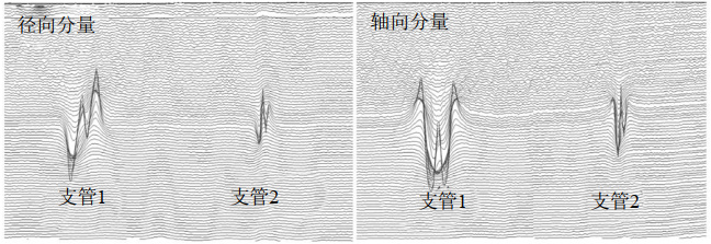 檢測信號經(jīng)過(guò)數據處理等步驟,可視化展現盜油孔漏磁信號曲線(xiàn),如圖 2所示。盜油孔(支管)漏磁信號具有以下特征:徑向信號,外層為負峰—正峰增厚信號,內層為正峰—負峰減薄信號;軸向信號,外層為負向的增厚信號,內層為正向的減薄信號。同時(shí),渦流通道有顯著(zhù)信號波動(dòng)。