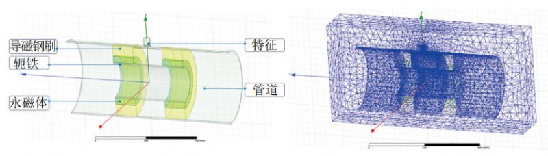 建立等尺寸仿真模型(圖 3)進(jìn)行驗證。漏磁檢測器最關(guān)鍵的磁回路組件由永磁體、軛鐵、鋼刷、鋼管4部分構成。根據實(shí)際測量尺寸,建立磁回路組件以及盜油孔(支管)模型,采用縱向截面對稱(chēng)的三維1/2模型減小計算規模。四面體網(wǎng)格剖分,對特征區域及空氣隙進(jìn)行局部加密,用以捕捉關(guān)注區域的漏磁場(chǎng)變化。以1 mm提離值,對特征軸向路徑進(jìn)行漏磁場(chǎng)變量提取。