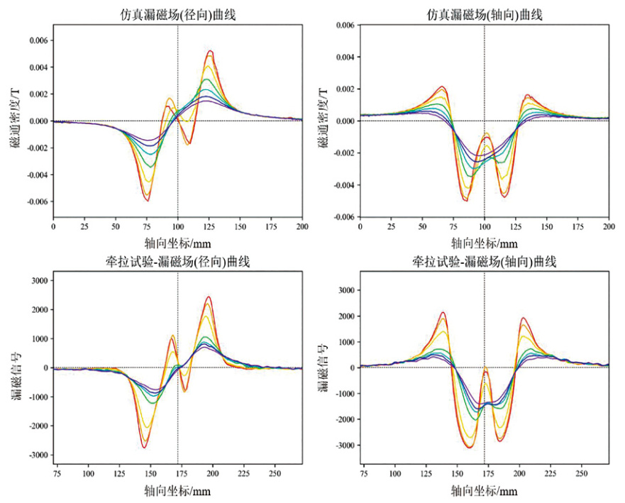 將仿真數據與牽拉試驗數據、現場(chǎng)檢測數據進(jìn)行對比(圖 4、圖 5),可以發(fā)現徑向、軸向漏磁信號相位一致,徑向信號中負—正峰代表增厚,正—負峰代表減薄,增厚及減薄信號的相對幅值基本一致;軸向信號中負向單峰代表增厚,正向單峰代表減薄,增厚及減薄信號的相對幅值基本一致;驗證了仿真信號的形態(tài)與牽拉試驗、現場(chǎng)檢測數據的一致性,可以開(kāi)展仿真研究。