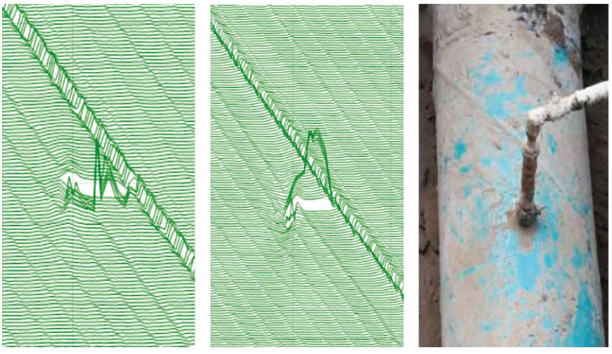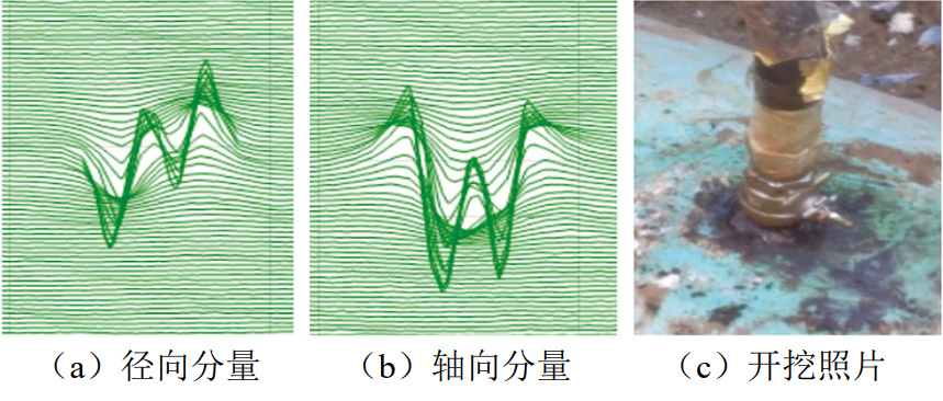 盜油鉆孔可能產(chǎn)生未脫離管壁的碎屑等異物,若異物伸入管內,探頭經(jīng)過(guò)將與管壁發(fā)生提離,信號發(fā)生畸變,可能影響減薄信號的識別。整個(gè)探頭發(fā)生浮動(dòng),數個(gè)漏磁檢測通道信號發(fā)生“漂移”,產(chǎn)生了特殊的信號畸變圖像。如圖 13所示,在實(shí)際檢測工作中,曾發(fā)現類(lèi)似信號,并開(kāi)挖確認了盜油孔(支管)的存在,由于探頭提離產(chǎn)生的信號畸變明顯,非典型盜油孔漏磁信號軸向分量與仿真信號畸變相位相反。