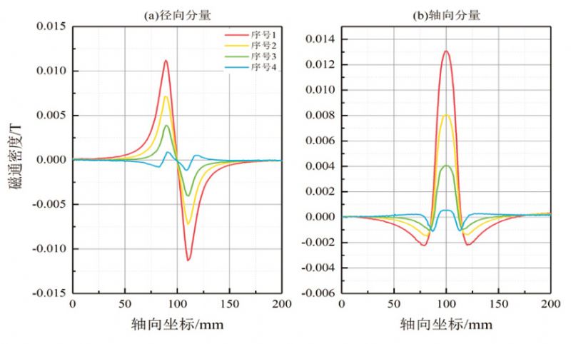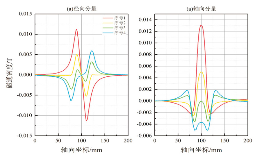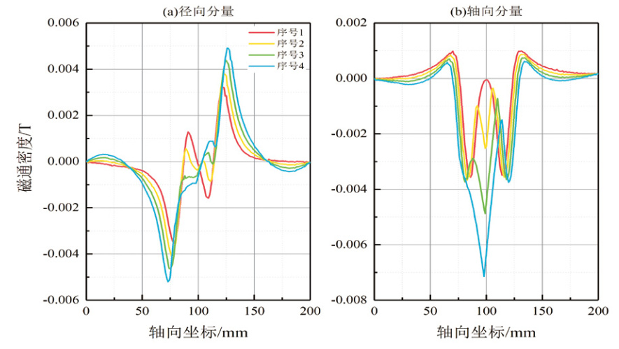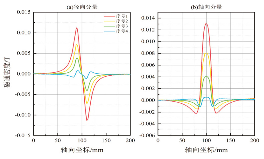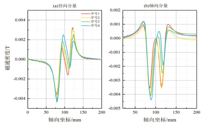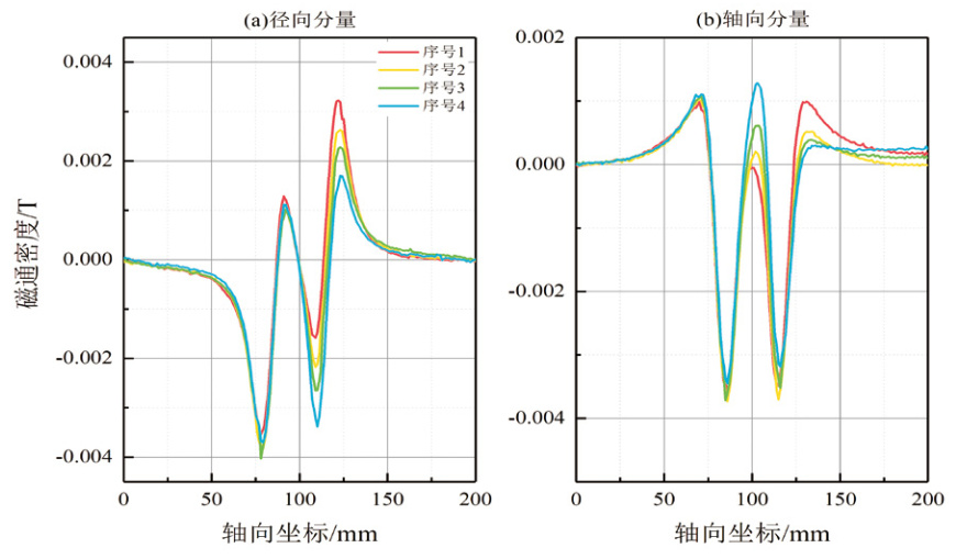 穩態(tài)仿真提取的漏磁場(chǎng)為沿著(zhù)軸向變化的底噪磁場(chǎng)與漏磁場(chǎng)的疊加場(chǎng)。為了消除底噪磁場(chǎng)的影響,對穩態(tài)仿真數據進(jìn)行了相應的去底噪處理。將漏磁檢測數據與仿真數據進(jìn)行對比,形成軸向、徑向方向的漏磁場(chǎng)分量曲線(xiàn)圖形。