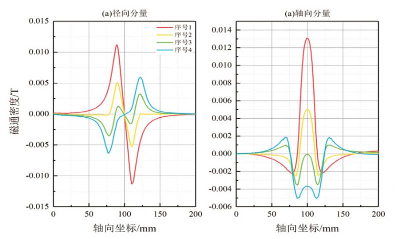 通過(guò)幾何關(guān)系求解軌跡坐標,得到場(chǎng)變量提取路徑。如圖 12所示,盜油孔(支管)漏磁信號發(fā)生畸變,該信號曲線(xiàn)與常見(jiàn)盜油孔(支管)信號不同,隨著(zhù)異物伸入深度的增加,徑向分量中開(kāi)孔信號越不易辨識;軸向分量中減薄信號出現異常相位,隨著(zhù)異物伸入深度的增加,異常幅值增大。