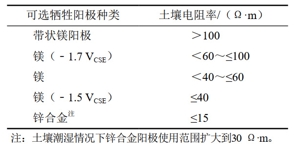 (1)材料選擇。犧牲陽(yáng)極應用靈活、易于安裝、不需要外部電源、維護簡(jiǎn)單,土壤環(huán)境常用犧牲陽(yáng)極見(jiàn)表 1。鎂陽(yáng)極適用于各類(lèi)土壤環(huán)境,具有電位負、密度小、單位質(zhì)量發(fā)生的電量大等特點(diǎn),缺點(diǎn)是電流效率只有50%。鋅陽(yáng)極適用于土壤電阻率較低的潮濕土壤環(huán)境中,具有自腐蝕小、電流效率高、不會(huì )產(chǎn)生過(guò)保護等特點(diǎn)。