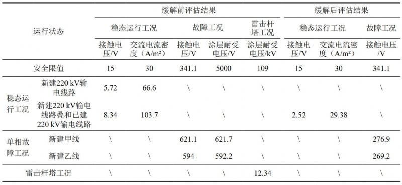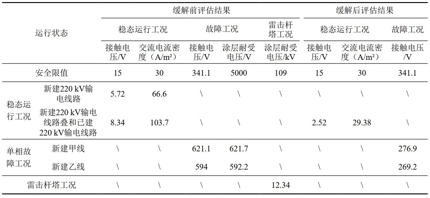 (1)根據上述交流干擾評估流程,本項目評估結果:①基于管道沿線(xiàn)的土壤電阻率測量數據,確定電氣等效兩層土壤模型,表層至0.69 m深處土壤電阻率為79 Ω·m,下層(0.69 m以下)土壤電阻率為19.35 Ω·m;②輸電線(xiàn)路在不同運行工況下對油氣管道的干擾評估結果見(jiàn)表 1。由表 1干擾評估結果可知,在新建輸電線(xiàn)路或同時(shí)考慮已建輸電線(xiàn)路穩態(tài)工況下,流過(guò)1 cm²缺陷破損點(diǎn)的最大交流電流密度數值均超過(guò)安全限值30 A/m²,存在管體腐蝕風(fēng)險,需要采取緩解措施;在新建輸電線(xiàn)路甲線(xiàn)和乙線(xiàn)分別發(fā)生單相對地故障工況下,管道沿線(xiàn)地面可接觸金屬結構物接觸電壓均超過(guò)安全限值341.1 V,存在人身安全風(fēng)險,需采取緩解措施。
