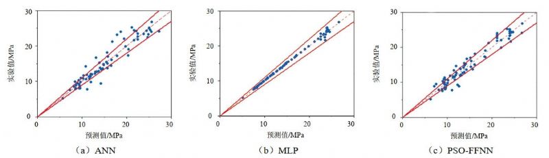 文中采用的數據來(lái)自文獻[2]中的實(shí)驗數據,預測值越靠近中間的紅色虛線(xiàn),預測結果越接近實(shí)驗值。虛線(xiàn)兩側的紅色實(shí)線(xiàn)表示預測值與實(shí)驗值誤差為±10%。在三種預測模型訓練結果中,MLP模型的訓練結果最好,所有預測結果的誤差均在±10%以?xún),而ANN和PSO-FFNN的訓練結果都有部分樣本預測誤差超過(guò)了±10%(圖 4)。