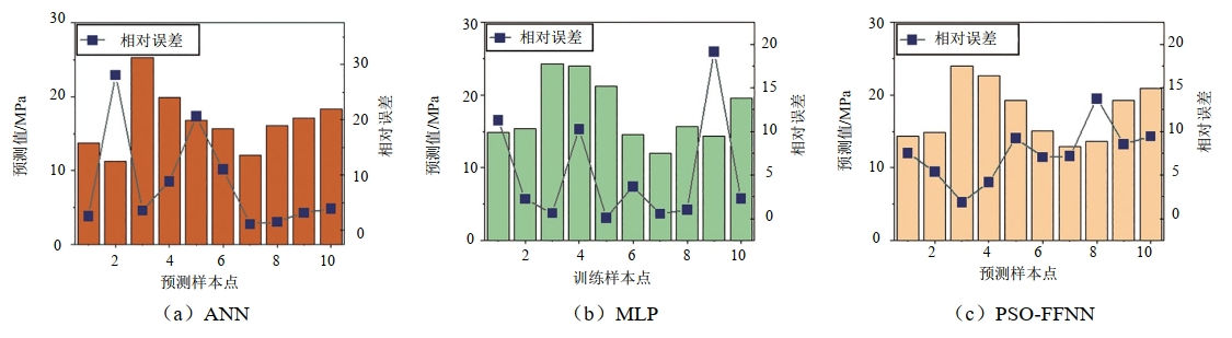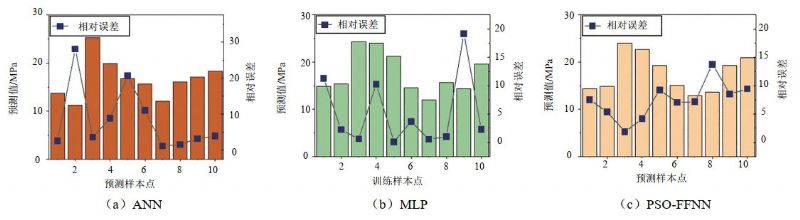 結合三種預測模型的預測結果(圖 5),柱狀圖顯示的是三種模型的預測值,折線(xiàn)圖顯示的是每個(gè)預測樣本點(diǎn)的相對誤差?梢钥闯,ANN模型最大相對誤差接近30%,三個(gè)樣本點(diǎn)相對誤差大于10%。MLP模型的最大相對誤差接近20%,三個(gè)樣本點(diǎn)相對誤差大于10%。而PSO-FFNN模型最大相對誤差接近15%,其余樣本點(diǎn)相對誤差均小于10%。從預測結果看,PSO-FFNN模型的預測結果最為穩定。