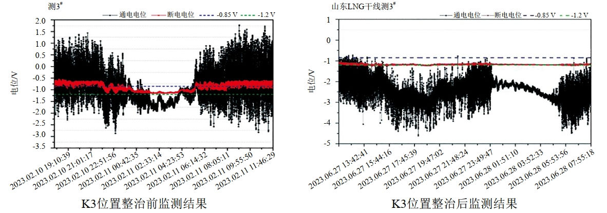 排流實(shí)施后,利用試片法對管道沿線(xiàn)進(jìn)行直流雜散電流復測,數據顯示管道電位波動(dòng)幅度明顯降低,其中K2處通電電位波動(dòng)由﹣4.364 V~4.06 V降低為﹣1.127 V~﹣3.318 V。管道斷電電位正于保護準則的比例均小于5%(圖 2),符合《AS 2832  Cathodic protection of metals Part1: pipes and cables》和GB 50991―2014要求,管道處于有效保護狀態(tài)。雜散電流整治效果評估完成后,在雜散電流整治區域安裝1處ER腐蝕速率探頭,利用腐蝕速率采集儀每年對ER腐蝕速率探頭的試片厚度進(jìn)行采集,根據壁厚減薄量持續監測管道的腐蝕速率,保證管道腐蝕情況安全受控。