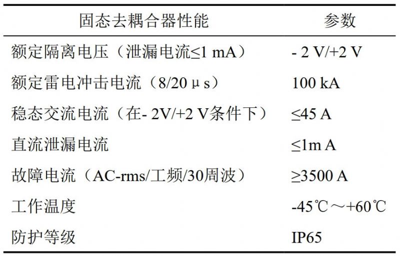 (2)固態(tài)去耦合器的選擇。作為直流隔離和交流導通裝置,當兩個(gè)端子之間的電壓超過(guò)直流導通閾值時(shí),固態(tài)去耦合器呈現直流低阻抗導通模式;當兩個(gè)端子之間的電壓降低到直流導通閾值以下時(shí),固態(tài)去耦合器重新對直流電流呈現高阻抗,切斷直流電流。固態(tài)去耦合器在遇到故障電流或雷擊電流沖擊時(shí),內部模塊能瞬間導通,將干擾電流通過(guò)接地泄放入大地,從而起到了對管道設施和人員保護的作用(表 1)。