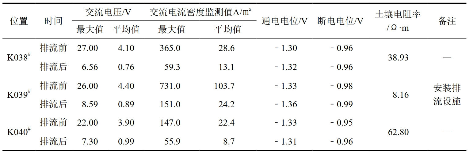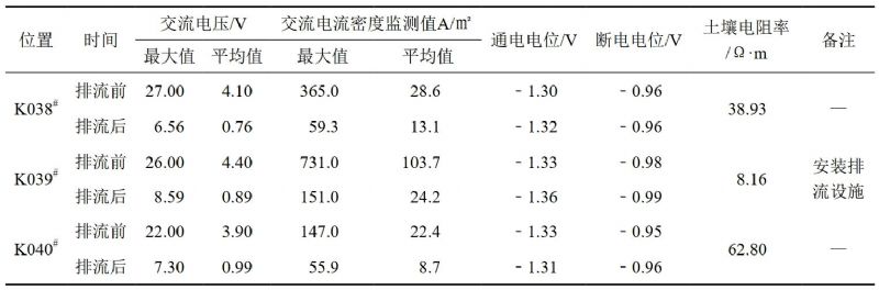 檢測評價(jià)排流后效果,包括設施檢查、接地極接地電阻測試、接地極電位測試、排流量測試等。通過(guò)檢測數據分析(表 2),管道K039#測試樁處安裝排流設施后,交流電壓平均值由4.4 V降至0.89 V,交流電流密度平均值由103.7 A/m²降至24.2 A/m²。K038#—K040#管段的交流電流密度平均值均小于30 A/m²,其余臨近管道位置的交流電壓及交流電流密度均達到排流防護效果;地床電阻0.88Ω,小于4 Ω,交流排流量在476 mA~578 mA,排流地床開(kāi)/閉合電位無(wú)變化;管道排流器安裝前后,所涉及管段的斷電電位均在﹣0.95 V~﹣0.99 V,陰保正常。