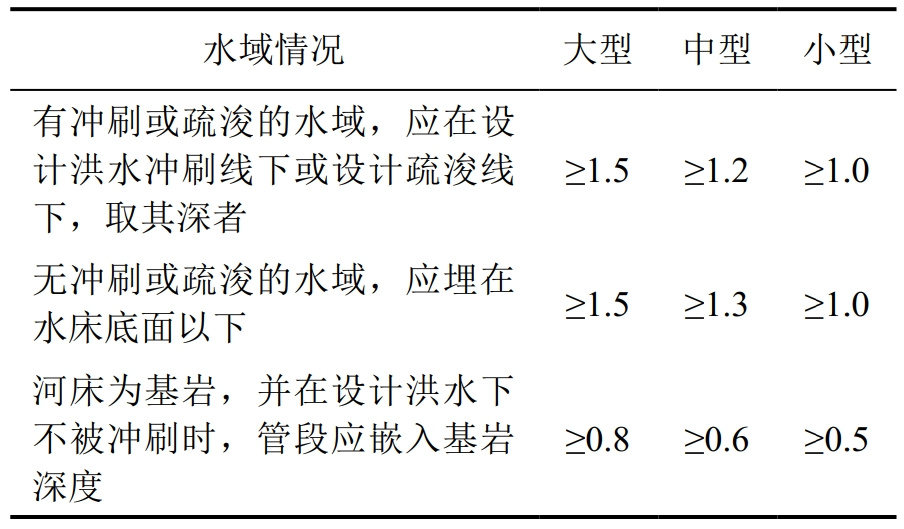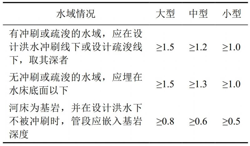 二是GB 50423―2013中4.1.2規定“挖溝法穿越管段的最小埋深,應根據工程等級與相應設計洪水沖刷深度或疏浚深度要求確定,并應符合相應埋深的界定范圍”。根據挖溝法穿越管段的最小埋深表(表 2),認定應選用管頂埋深達到?jīng)_刷線(xiàn)以下1.5 m的管道埋深設計方案。