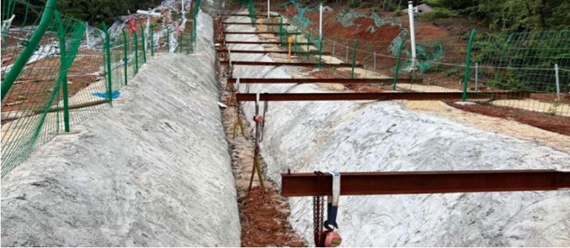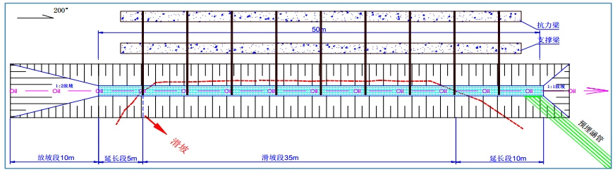(3)管道應力釋放。開(kāi)挖管道長(cháng)度50 m,超出滑坡邊界5~10 m,開(kāi)挖深度2 m,至管道底面,底面寬度為管道兩側各0.5 m(圖 2)。為防止開(kāi)挖的溝槽塌落或雨水沖刷造成水土流失,對溝槽邊坡面用素砼進(jìn)行噴護。同時(shí)預防坑內積水,在低洼一端埋設涵管,將匯水引向坡外。