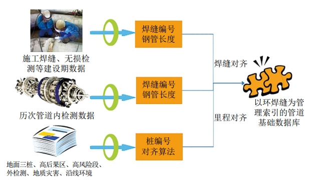 在建設環(huán)焊縫開(kāi)挖復檢APP的同時(shí),公司借力環(huán)焊縫排查工作,以環(huán)焊縫為基準對齊了管道建設期、內檢測、地面三樁、高后果區、地質(zhì)災害、沿線(xiàn)環(huán)境等數據,實(shí)現了管道業(yè)務(wù)數據的集約化整合(圖 3),夯實(shí)了數據挖掘應用基礎。