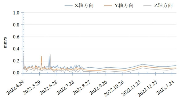 (4) 管道應力監測數據分析。施工后對管道應力應變、位移(沉降)、振動(dòng)實(shí)施9個(gè)月的現場(chǎng)監測。應力監測時(shí)程曲線(xiàn)如圖 3,在整個(gè)監測周期內,監測截面管道附加應力均處于較小值,最大拉應力6.93 MPa,最大壓應力﹣8.95 MPa,遠未達到藍色預警值。累積沉降位移變化曲線(xiàn)如圖 4,當前測點(diǎn)累積沉降位移值偏小,僅為﹣0.793 mm ,遠小于安全閾值10 mm。2個(gè)監測截面振動(dòng)速度隨時(shí)間變化曲線(xiàn)如圖 5、圖 6,各測點(diǎn)振動(dòng)速度值較小,均遠小于安全閾值。其中,Z01測點(diǎn)沿Z軸方向振動(dòng)速度最大值為0.86 mm/s,Z02測點(diǎn)沿X軸方向振動(dòng)速度最大值為0.31 mm/s,均小于管道安全速度1.7 cm/s。