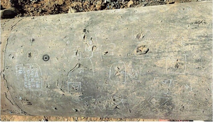防腐層破損點(diǎn)檢測。對裸露段下游15m管道進(jìn)行了開(kāi)挖暴露,采用10 kV脈沖電火花檢漏儀對管道裸露部分進(jìn)行漏點(diǎn)檢測,檢測長(cháng)度共計36 m。經(jīng)檢測發(fā)現480余處防腐層破損,主要位于管道9點(diǎn)、0點(diǎn)、3點(diǎn)時(shí)鐘區域(圖 2),管道底部防腐層無(wú)明顯破損,說(shuō)明其損壞原因由水毀所致。其中21 m裸露段管道防腐層已基本失效,新開(kāi)挖段管道防腐層存在部分破損。