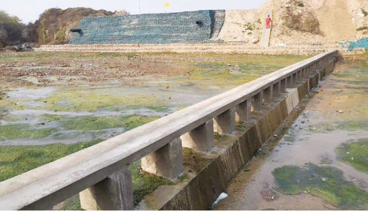 工程保護。河道北側邊坡采用D159 mm鋼管樁支護;露管段管道東側約5 m處設置生態(tài)袋擋土墻一道,擋土墻至東側坡體采用生態(tài)袋恢復,表層生態(tài)袋裝填有本土易生長(cháng)的草籽。生態(tài)袋邊坡碼砌前將溝內應急處理時(shí)的袋裝土清除,淤泥土采用三七水泥土換填,換填后表層鋪設防滲膜。河道北側設置格賓石籠擋墻一道,河道南側陡坎位置設置格賓石籠擋墻一道。河道內管道下游,垂直河道方向設置混凝土防沖墻,防沖墻頂設置巡檢通道,下游設置混凝土跌水,設置混凝土過(guò)水面(圖 3)。