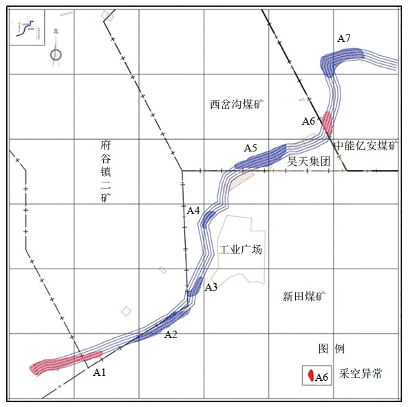 綜合勘查區5條瞬變電磁測線(xiàn)的解釋成果,根據點(diǎn)號將各測線(xiàn)異常展布在平面上,圈定了7處異常區。其中采空區4處,分別為A1、A5、A6、A7;圍巖富水或采空區局部含水3處,分別為A2、A3、A4(圖 5)。