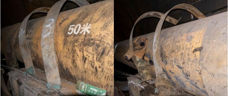 抽水完成后,檢測人員在隧道共發(fā)現28處管道支座上的管箍出現不同程度的變形、螺栓脫落等失效問(wèn)題,其中西側進(jìn)口段的靠近隧道洞口的支墩變形最大(圖 2)。該段多處管箍出現明顯向洞內傾斜變形的特征,造成了管箍螺栓脫落、彎曲或崩斷,說(shuō)明管道在安裝之后出現非常大的位移,由于管箍的約束而產(chǎn)生了強烈的相互作用,導致多個(gè)螺栓彎曲或崩斷等情況。統計發(fā)現靠近錨固墩位置的管箍未損壞,隨著(zhù)離錨固墩距離的增加,損壞管箍數量也相應增加,說(shuō)明錨固墩對管道起到一定固定作用。根據支座翹起的情況可以判斷管道的變形量非常大,可達30 cm~50 cm。