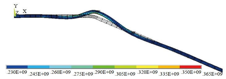 摘要:針對隧道內的油氣管道嚴重位移、管箍變形和螺栓脫落等情況進(jìn)行計算分析。根據管道安裝的工況采用有限元計算方法,考慮內壓、溫差、水浮力荷載和管箍約束等因素以及充水運營(yíng)、抽水檢查和再次充水三種工況,對管道不同工況進(jìn)行模擬計算。計算結果顯示雖然管道處于安全的應力狀態(tài),但是彎頭附近的支座螺栓出現應力超標的情況。數值模擬計算結果解釋了問(wèn)題出現的原因,并依此提出了管道支座修復的建議。