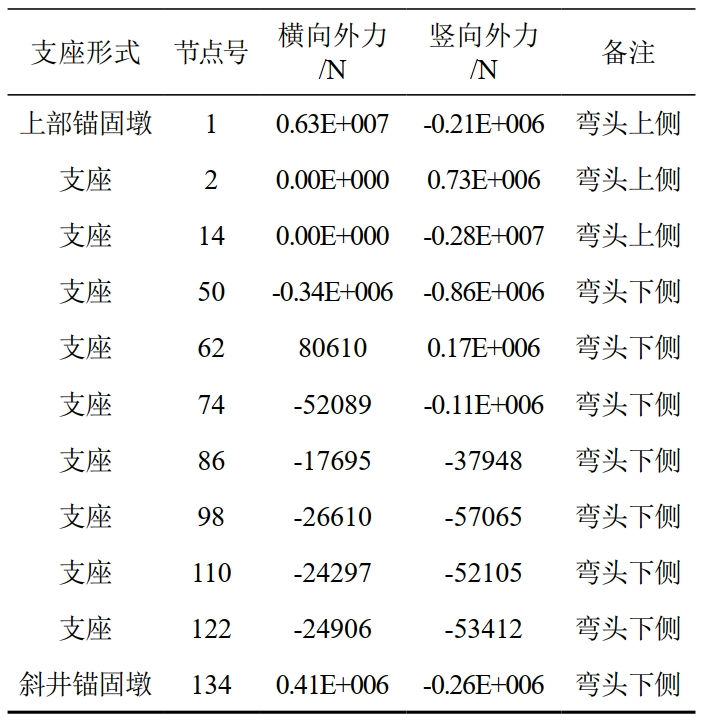 支座約束力和螺栓強度校核。根據上述有限元計算結果,提取模型關(guān)鍵節點(diǎn)號得到對應的錨固墩及支座的約束力。其中力的方向規定,橫向作用力沿著(zhù)X軸正向為正,豎向作用力沿著(zhù)Y軸正向為正。除了錨固墩對管道提供的約束力之外,在彎頭附近的2~3個(gè)支墩范圍內同樣給管道提供了非常大的約束力。支座提供的外力,既有豎向向上的力也有向下的力。根據支座的特點(diǎn),支座向上的力由支座底部的混凝土基座提供,支座向下的力由鋼螺栓傳遞至底板提供。由于錨固墩體積較大,可以穩固地約束管道,本文不再考慮錨固墩的約束力和結構的校核。對于支墩而言,體積較小,且兩側僅有兩條不銹鋼管箍和4個(gè)Φ18 mm螺栓固定。參考《鋼結構設計規范》確定Q235螺栓的抗拉強度取值140 N/mm2,抗剪強度可取70 N/mm2進(jìn)行計算。