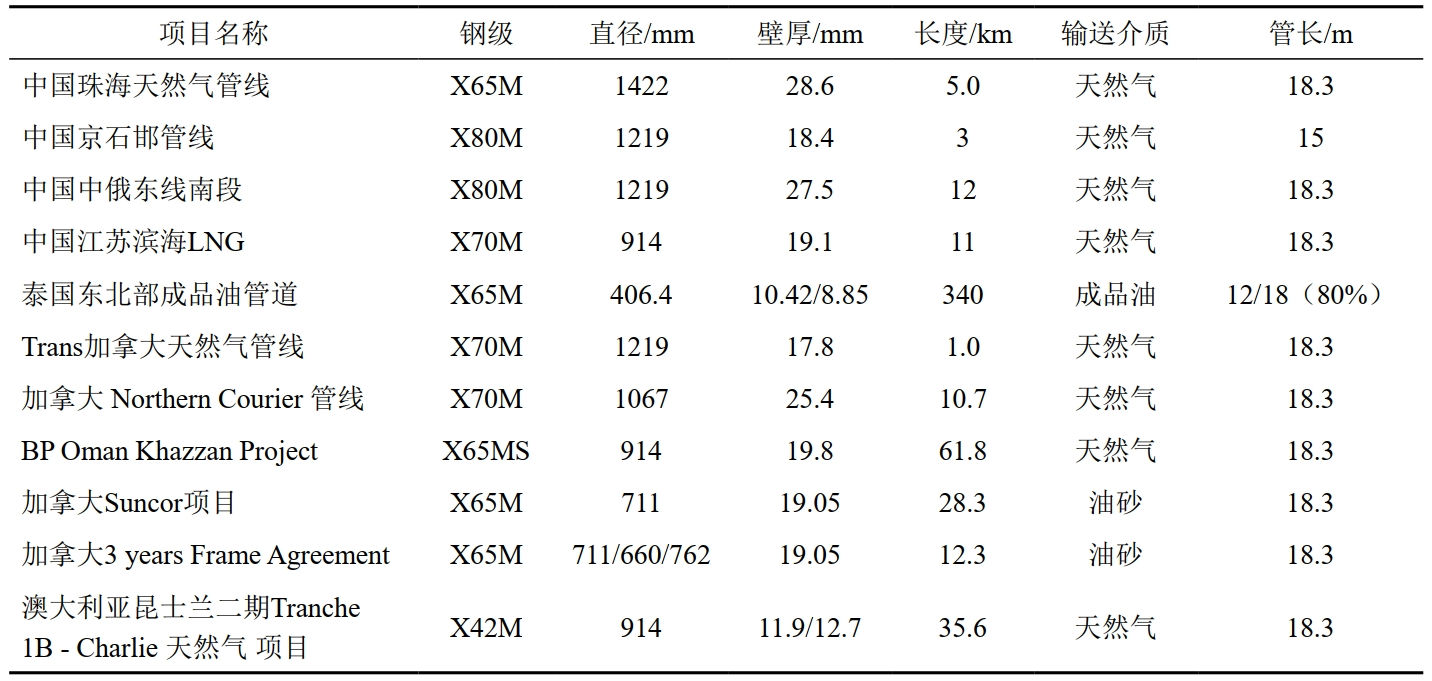 據統計,天然氣管道發(fā)生泄漏的首位失效因素為環(huán)焊縫破裂,占比約45%。而降低環(huán)焊縫失效概率最簡(jiǎn)單有效的辦法就是減少環(huán)焊縫數量。國家管網(wǎng)集團油氣管道安全高效建設關(guān)鍵技術(shù)研究項目結果表明:18 m加長(cháng)鋼管與12 m鋼管相比,可減少1/3的環(huán)焊縫數量,同時(shí)降低20.38%的施工費用。近年來(lái)加長(cháng)管在國內外管道建設中都有應用(表 1)。