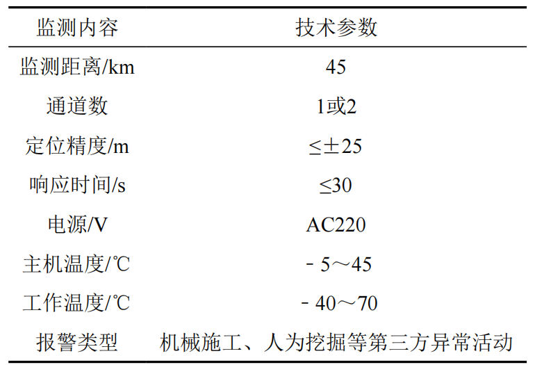 (1)技術(shù)原理。將光纖沿著(zhù)管道敷設,利用光纖的光散射、折射率等特性變化來(lái)感知管道周?chē)臏囟、壓力、應變等物理量。當管道泄漏時(shí),泄漏介質(zhì)與周?chē)h(huán)境的相互作用會(huì )引起這些物理量的改變,光纖傳感器能夠實(shí)時(shí)捕捉到這些變化并準確定位泄漏位置。光纖傳感技術(shù)具有分布式監測、抗電磁干擾、高靈敏度等優(yōu)點(diǎn),在管道泄漏檢測中得到了廣泛應用[2]。表 1是光纖傳感監測的主要技術(shù)參數。