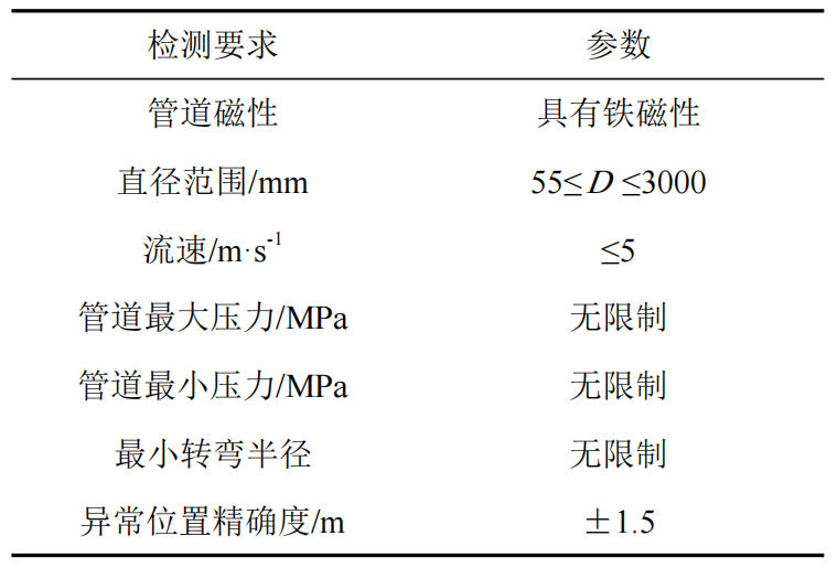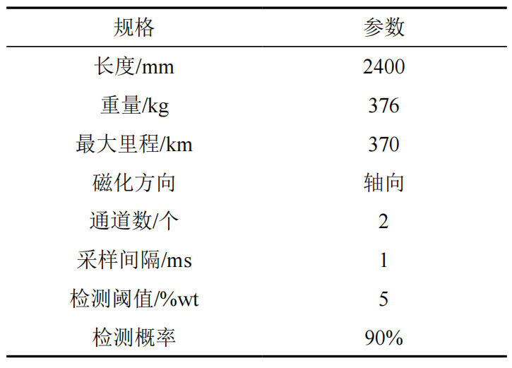 (1)技術(shù)原理。智能清管技術(shù)能夠充分利用日常管道清管時(shí)機,通過(guò)常規清管器、測徑清管器、鋼刷清管器、變形清管器和漏磁清管器等一系列清管措施,對管道內部各類(lèi)缺陷(凹陷變形、腐蝕減薄、焊縫異常等)進(jìn)行檢測。在清管作業(yè)過(guò)程中,它可以實(shí)時(shí)采集管道內壁的厚度、腐蝕情況、缺陷位置等信息,為管道的維護和泄漏預防提供數據支持[3]。表 2為常規漏磁清管器技術(shù)參數。