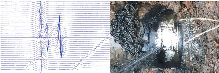 以長(cháng)慶油田某采氣廠(chǎng)輸氣管道為例,該管道全長(cháng)60 km,采用光纖傳感技術(shù)和物聯(lián)網(wǎng)技術(shù)相結合的智能監測系統。2019年1月11日8:45,監控系統發(fā)出管道泄漏報警信息(圖 2),根據壓力下降幅度和報警順序分析,準確定位泄漏位置位于2#閥室附近。指揮中心迅速通知相關(guān)人員現場(chǎng)核實(shí)及應急處置,確認該管道環(huán)焊縫處開(kāi)裂導致泄漏(圖 3)。應用光纖傳感監測系統,有效提高了管道異常工況發(fā)現的及時(shí)性,防止了泄漏事件進(jìn)一步擴大。