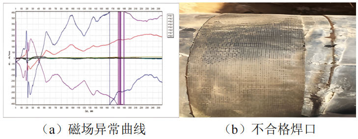 以某天然氣集輸管道為例,管道長(cháng)度41 km,管徑Φ508 mm×9/11 mm,運行壓力4.87 MPa ~4.92 MPa。由于設計問(wèn)題,該管道暫時(shí)無(wú)法進(jìn)行智能清管器檢測,于2024年開(kāi)展了非接觸式磁檢測。檢測發(fā)現:管道整體質(zhì)量良好,無(wú)變形、無(wú)表面凹坑,防腐層破損28處,存在1處不合格焊口(圖 5)。屬地單位立即組織對缺陷管段進(jìn)行更換及外防腐層修復,有效預防了管道泄漏事件的發(fā)生。
