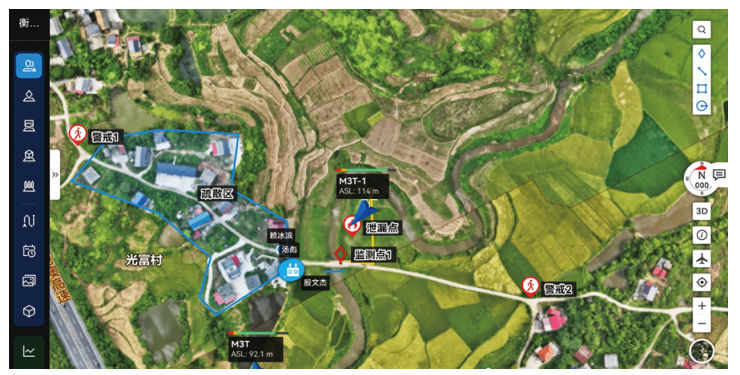 智能巡飛體系是應急現場(chǎng)信息獲取能力的關(guān)鍵補充。依托地理信息平臺,指揮中心或操作員可預先規劃多架無(wú)人機的自動(dòng)化巡飛航線(xiàn),并設定關(guān)鍵位置的懸停點(diǎn)與鏡頭參數。如分別部署航線(xiàn)持續監控泄漏核心區、追蹤河流污染帶擴散態(tài)勢、巡查主要救援通道保障通行安全等(圖 4)。
