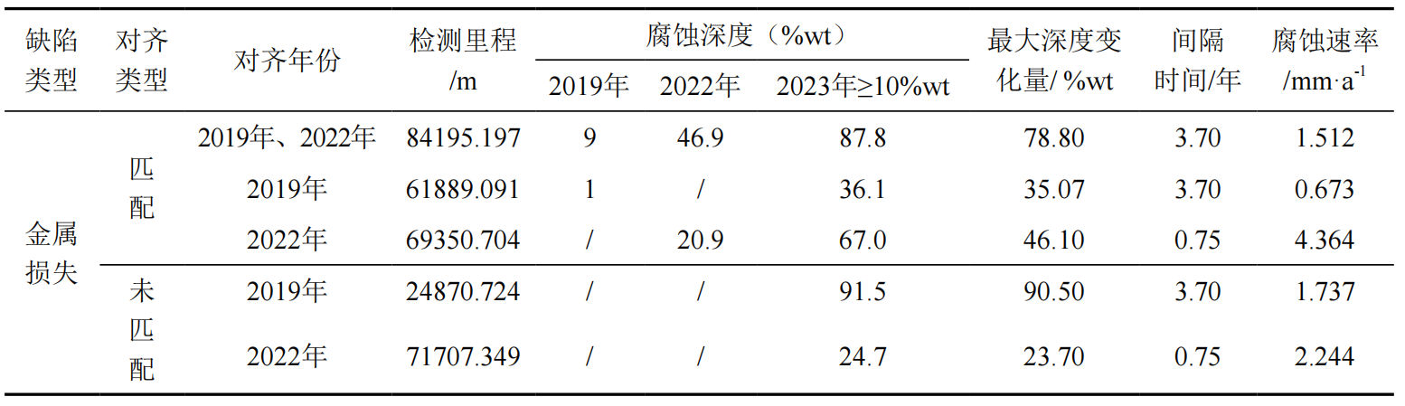 表 2 金屬損失最大深度變化量按對齊年份統計結果表