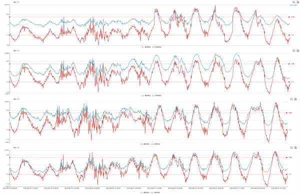(2)潮汐加地磁干擾。在有地磁暴發(fā)生時(shí),一些高緯度沿海地區還可監測到地磁與潮汐的疊加干擾。2025年8月19日發(fā)生地磁暴期間,某管段電位圖除了有潮汐干擾的特征外,還受地磁暴影響電位持續波動(dòng)(圖 5)。