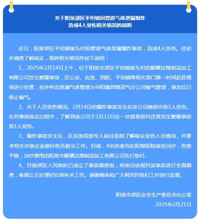據2月22日深夜中共陽(yáng)泉市郊區委員會(huì )宣傳部微信公眾號“陽(yáng)泉郊區之窗”發(fā)布情況說(shuō)明,爆炸事故發(fā)生在該公司磅房?jì),?人受傷。在對事故核實(shí)過(guò)程中,該公司于2月12日在一處簡(jiǎn)易房?jì)冗曾發(fā)生燃爆事故,致1人受傷。事故發(fā)生后,陽(yáng)泉郊區應急局派專(zhuān)人前往醫院了解核實(shí)受傷人員情況,并要求相關(guān)涉事企業(yè)做好傷員救治工作。目前,4名傷者均在陽(yáng)煤醫院接受治療,傷勢平穩,治療費用由陽(yáng)泉市順耀達煤制品加工有限公司先行墊付。陽(yáng)泉郊區人民政府已成立事故調查組,將依法依規對該事故進(jìn)行全面調查,客觀(guān)公正處理好后續有關(guān)工作。