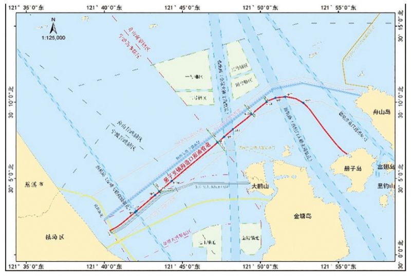 (2)實(shí)體航標與AIS虛擬航標布設。根據海域管理情況,在開(kāi)闊海域的杭州灣海底管道設置5個(gè)實(shí)體航標標示管道路由(圖 2),使過(guò)往船舶清晰可見(jiàn)。但在通航水域環(huán)境復雜、設施繁多的冊鎮海底管道,建設實(shí)體航標項目推進(jìn)和審批難度極大,故設置2個(gè)虛擬AIS電子航標。AIS虛擬航標不在水中設置構筑物,不會(huì )影響正常通航,通過(guò)無(wú)線(xiàn)電傳播信號,其航標效能發(fā)揮穩定,不受天氣、海況的影響和限制,有助于過(guò)往船舶通過(guò)雷達、電子海圖、船載AIS設備等途徑判斷與管道相對位置,為采取避險措施提供較準確的位置信息。與傳統航標相比,其建設和維護成本可節省約三分之二,還可根據實(shí)際需要調整其發(fā)射設備參數、數量、位置和進(jìn)行維護,也無(wú)需像傳統航標需固定周期開(kāi)展海上巡檢工作。
