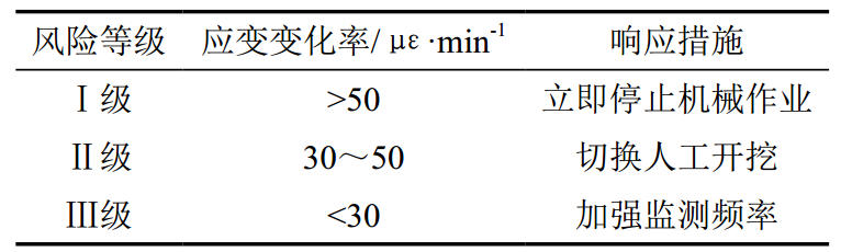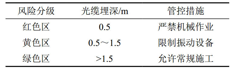 基于應力監測數據,以光纜為中心劃定三級防護區(表 2),動(dòng)態(tài)調整施工策略,實(shí)現風(fēng)險分級管控 。